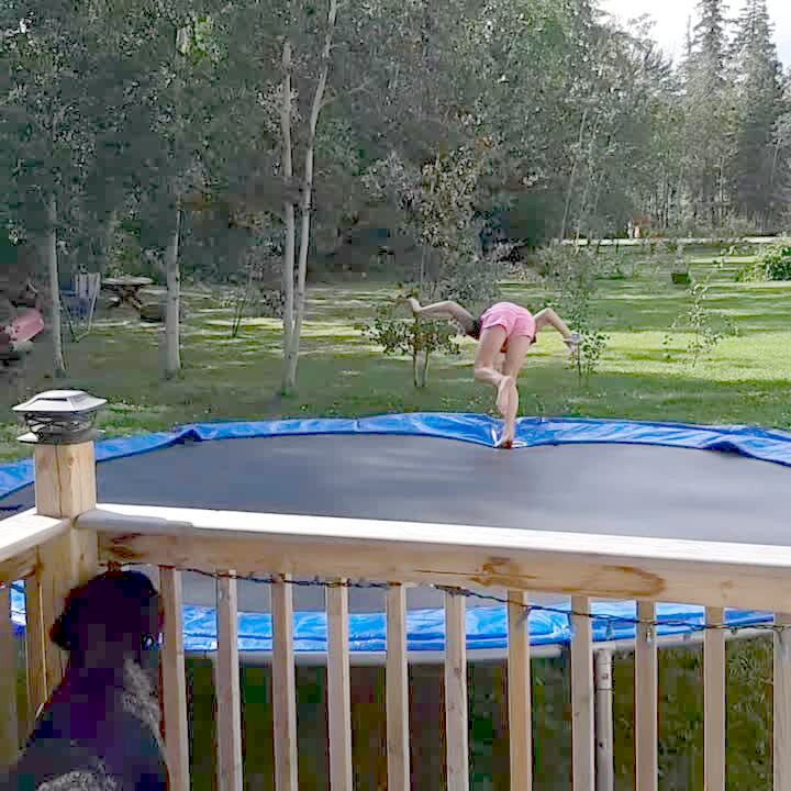 A young girl jumps on a backyard trampoline and does a flip but falls off the trampoline.