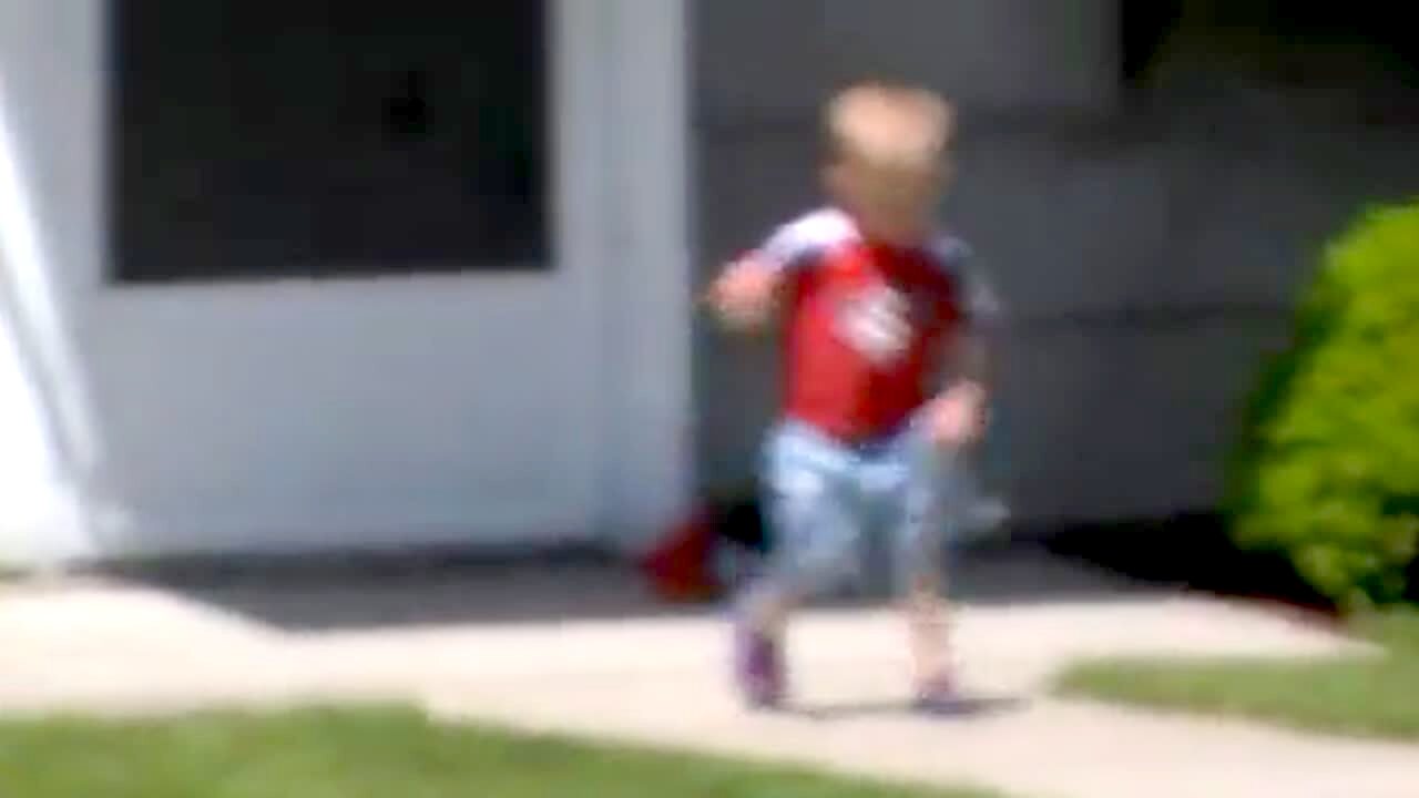 A boy climbs up the sides of a doorway. He jumps up and grabs the side of a living room balcony and tries to swing like Spiderman. He slips and falls hard on the floor. Short tails.