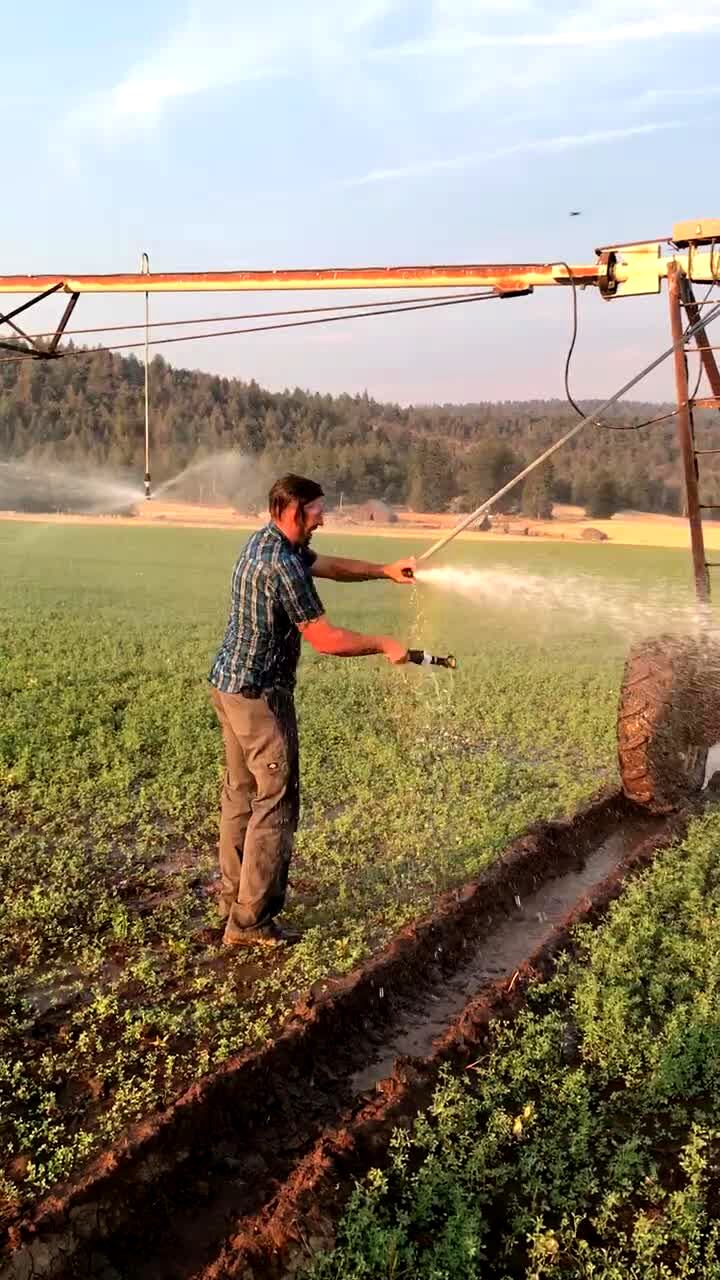 A man stands in a field and tries to fix an irrigation water hose. The hose sprays him in the face drenching him with water.