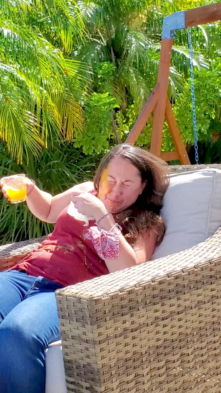A large bug is on a woman's shirt while she sits in a patio chair with a drink in her hand. Another woman tries to get the bug to walk onto her phone, but it jumps back at the first woman, and she spills her drink all over herself. Featured talent cleared (the woman with the drink and her friend with the phone).