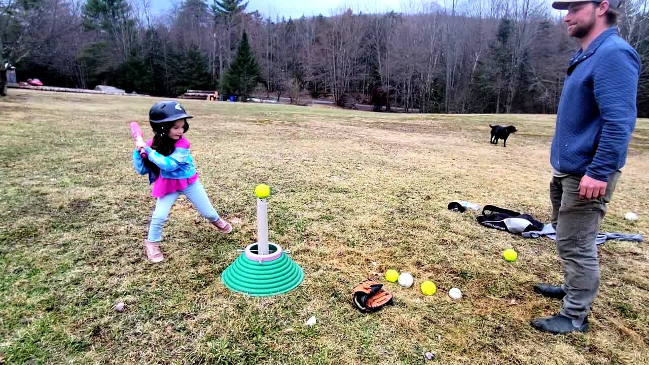 A young girl hits a baseball off a tee outside with a bat. The ball hits a man in the groin.