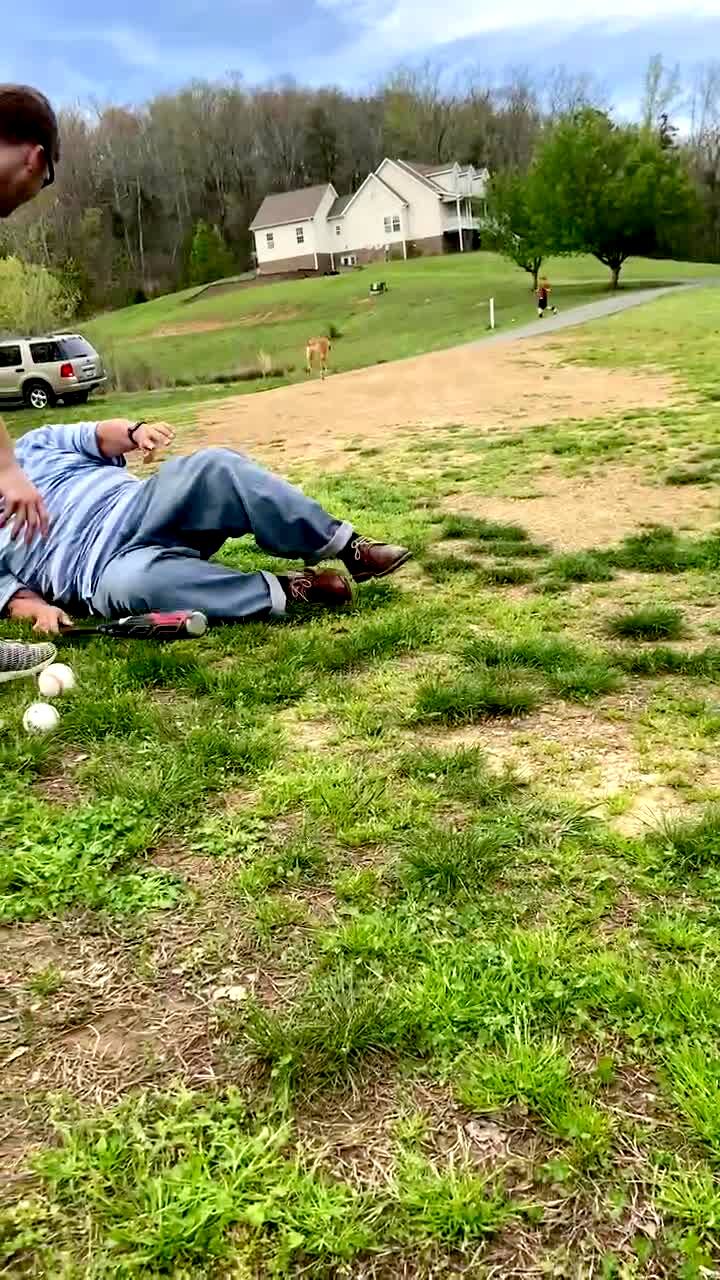 A senior man hits a baseball off a tee in a backyard with a bat and falls.