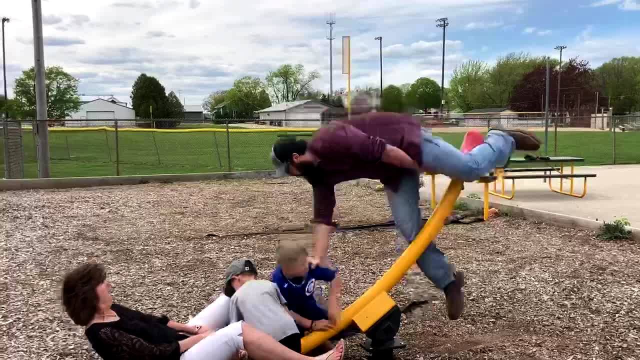 A man and a woman play on a see-saw on a playground. She gets two young boys to climb up on her side, lifting up the man. He loses his balance and falls off to the ground.