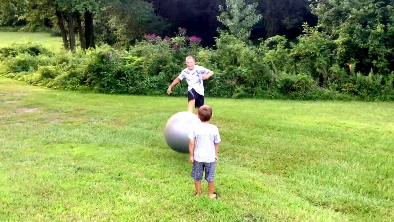 A teen boy kicks a yoga ball at a young boy in the backyard. When it hits him, the younger boy falls over.