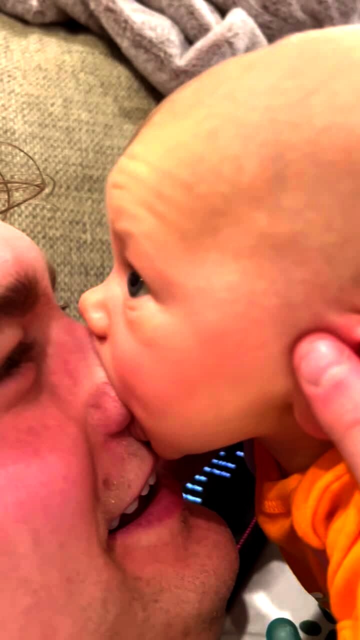 A man lies on a couch in a living room as a baby boy sucks on the man's nose. The man says, "I can't breathe through my nose!"