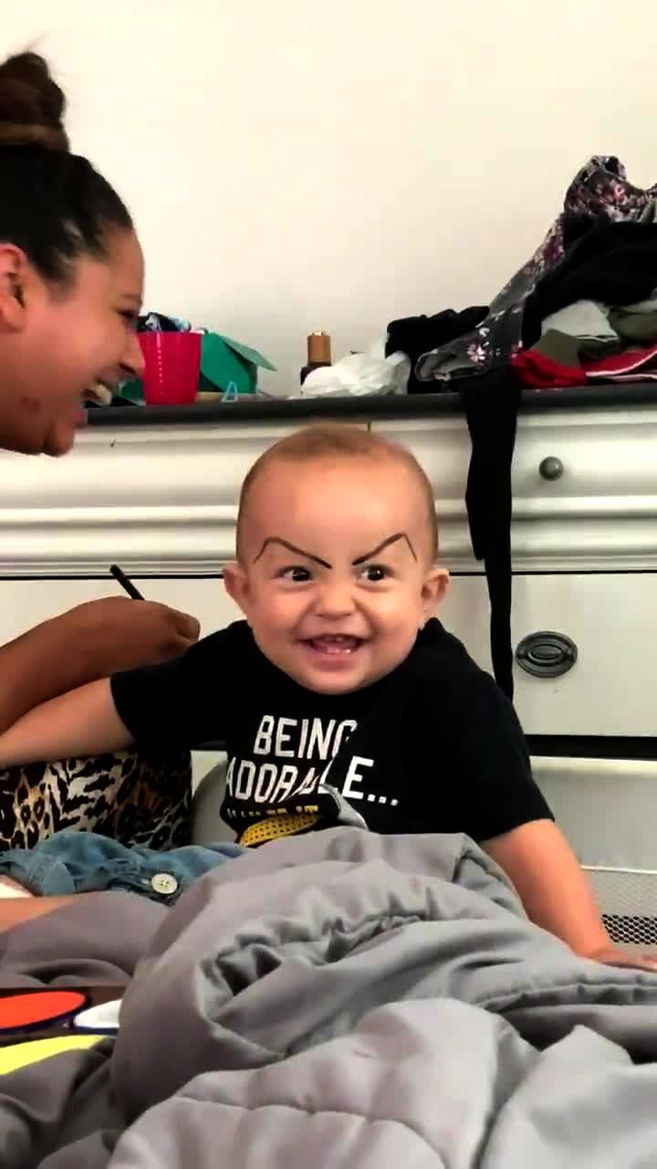 A woman draws angry, high-pointed eyebrows on a baby boy's face, and the boy smiles and looks crazy.