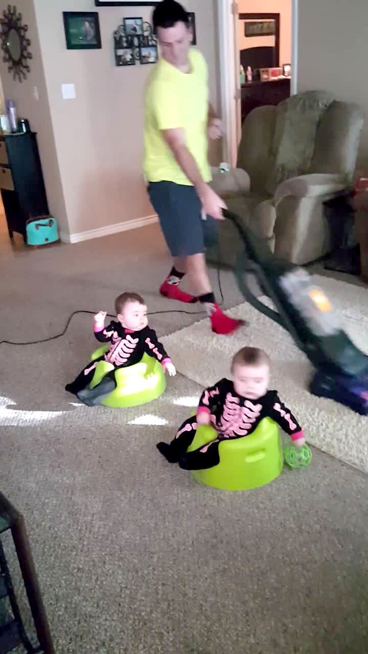 Twin baby girls watch their father vacuum and turn their heads back and forth together with his movement in the living room.
