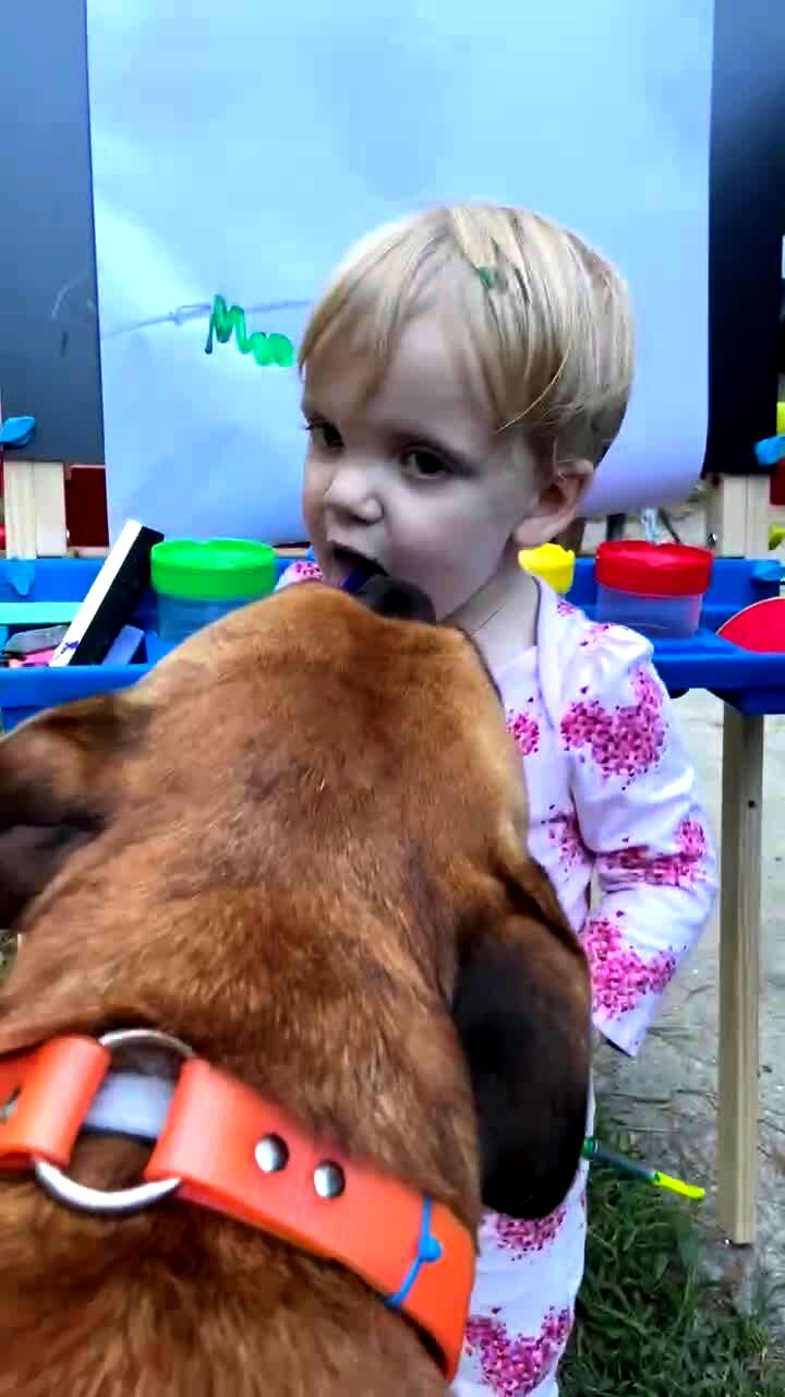 A tot girl paints in the backyard, and then she paints some on the dog, licks the brush, and brushes it across her eye.