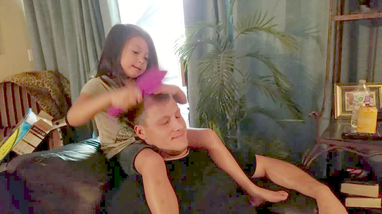 A young girl licks her hair brush and brushes her dad's hair in a living room repeatedly, and her mom laughs. Her dad asks her mom why it is funny.