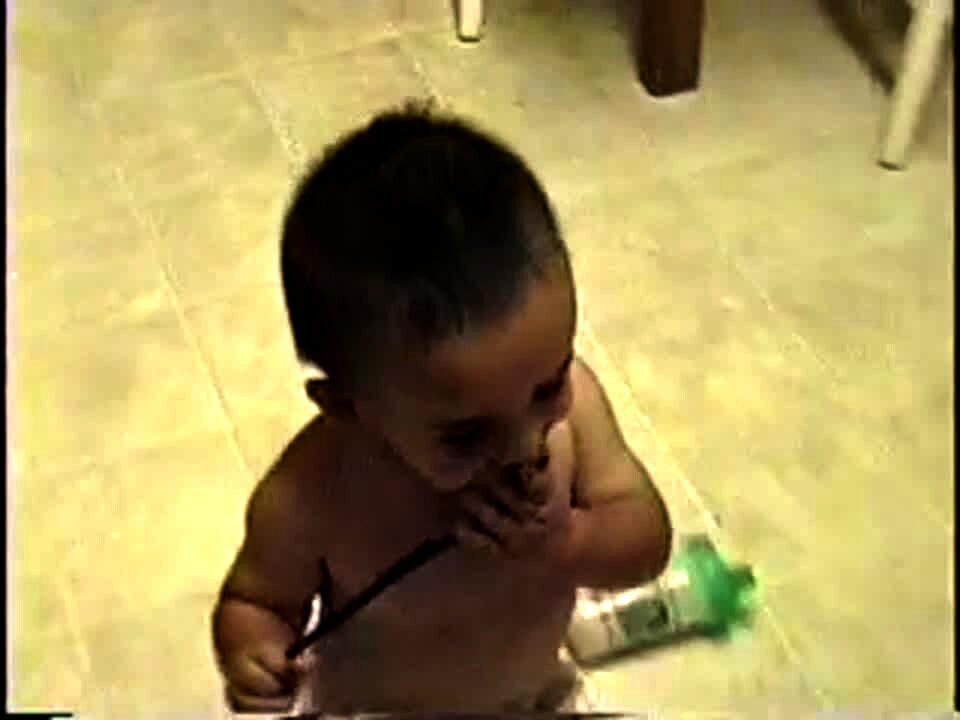 Baby boy walks around wearing only a diaper, brushing his teeth. When he turns around we see there is another toothbrush sticking out of his butt in the diaper.