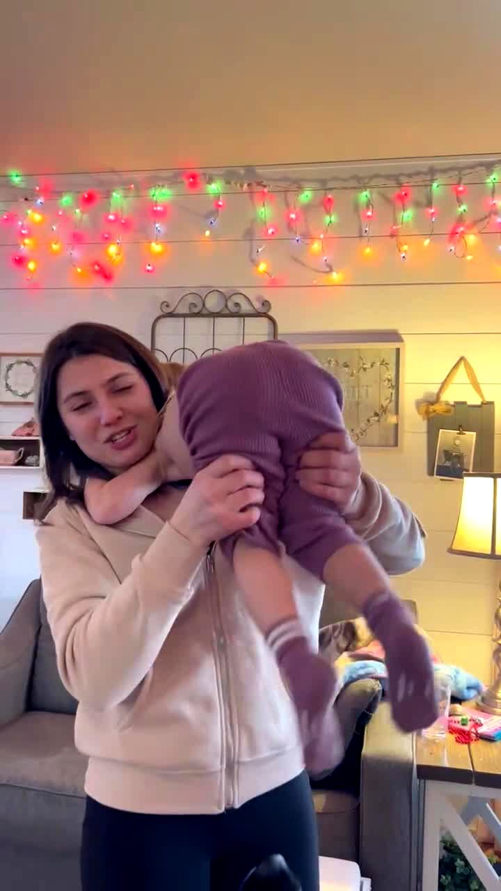 A woman holds a tot girl on her shoulder and moves her legs in and out and makes a cocking sound and the girl farts and they laugh in the living-room.
