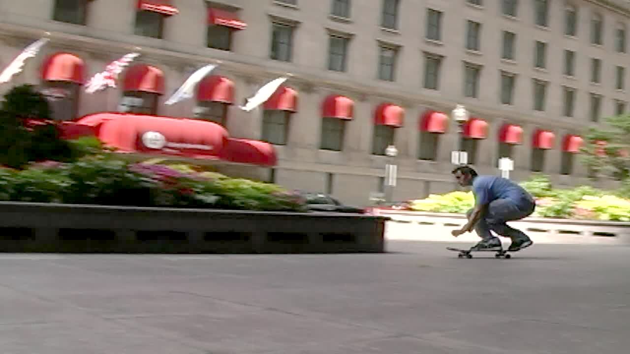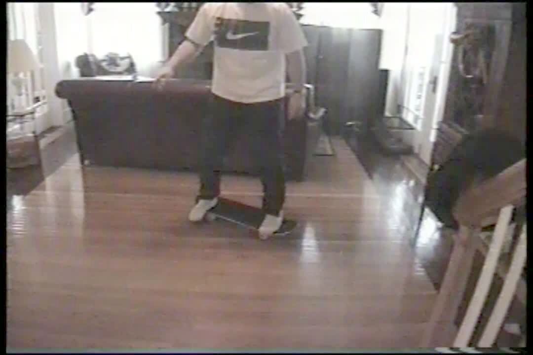 Dad tries to ride a skateboard in the house & crashes into the china cabinet & falls down. Shelf is about to fall on him but he stops it with his feet, glass still breaks. Man is ok - has short recovery, short tail. Bonehead.
