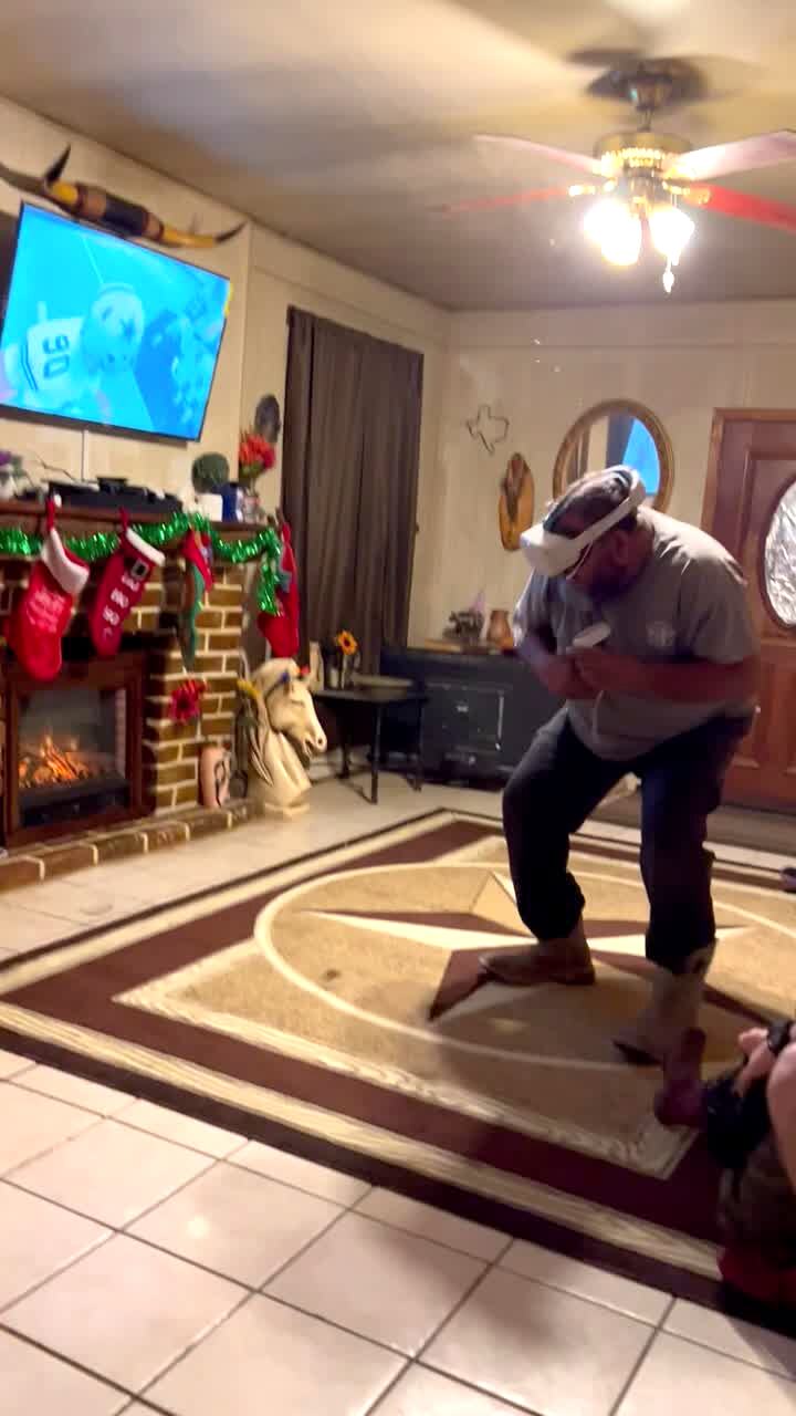 A man stands in the living room of a home and plays a virtual-reality football game. He attempts to throw the ball in the game, but his hand shatters a light on the ceiling fan.