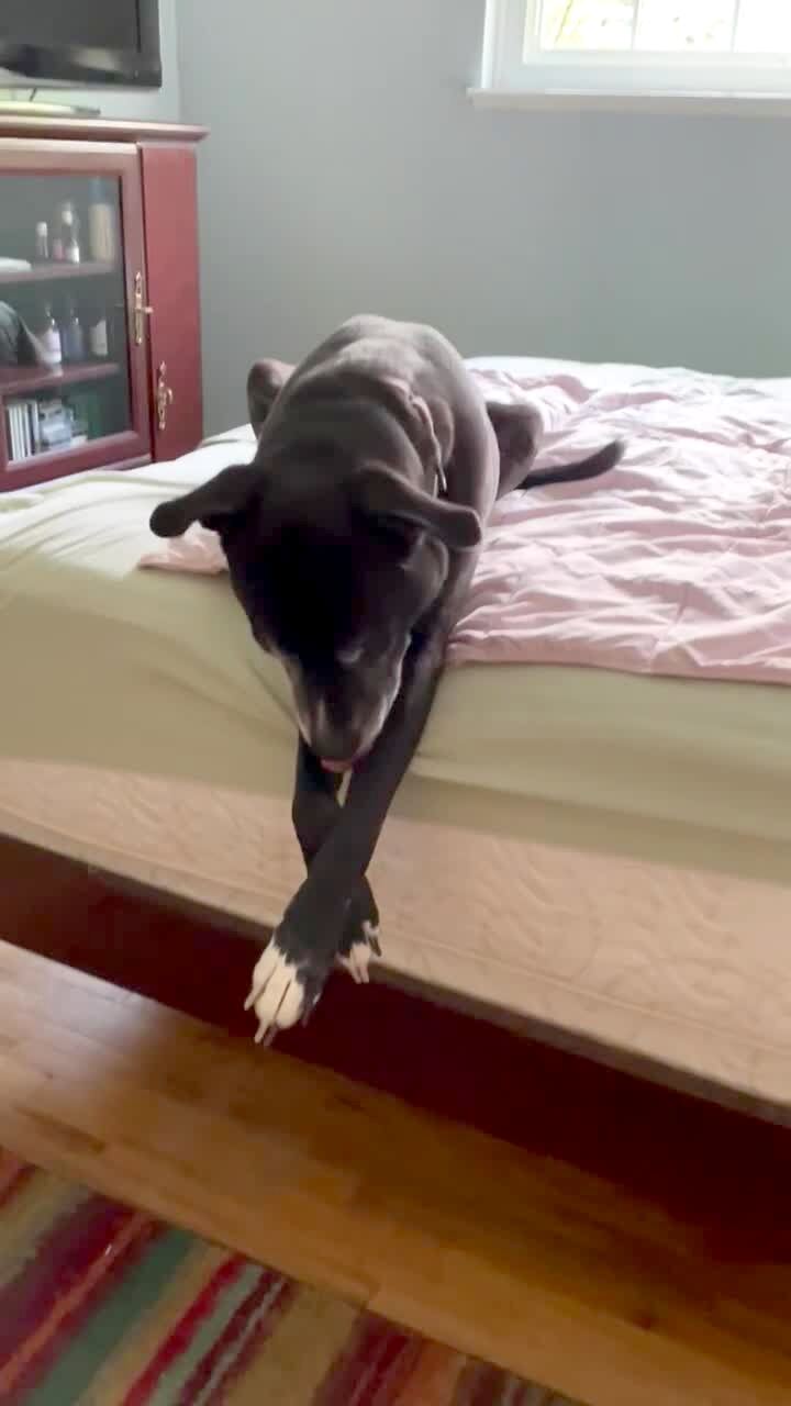 A dog gets caught in a woman's bra which hangs from a door handle. Each time he tries to make a run for it, the bra strap pulls him back in. No audio.