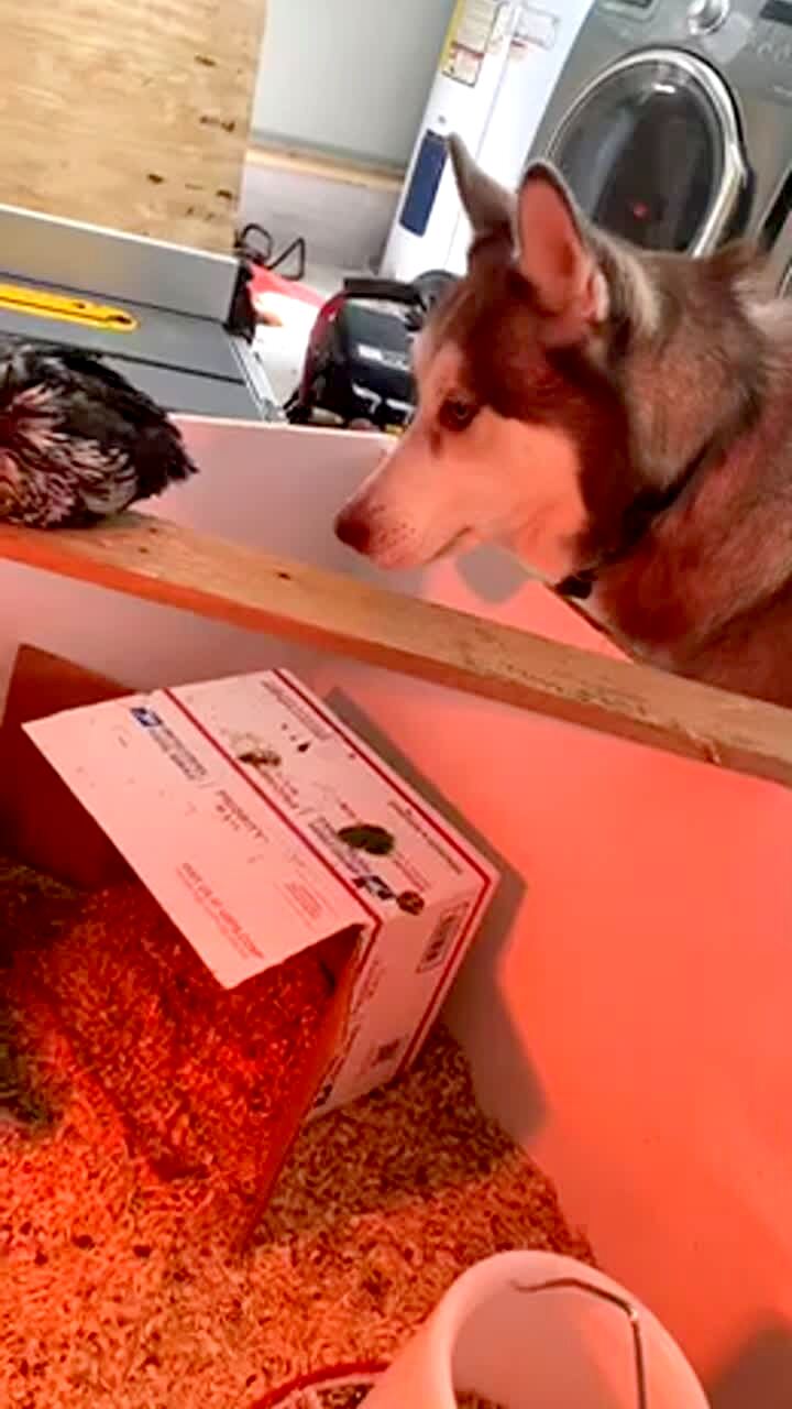 A husky dog sits next to an incubator full of baby chicken birds at home. He then opens his mouth and tries to bite one bird and a woman says that she will spank him.
