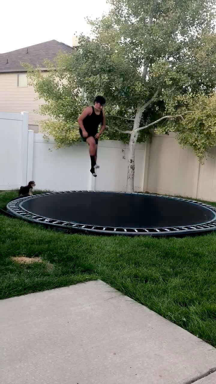 A young boy pushes a crowbar into the ground in a yard and jumps on top of it.Then he gets stuck upside down and yells for help. Security footage.