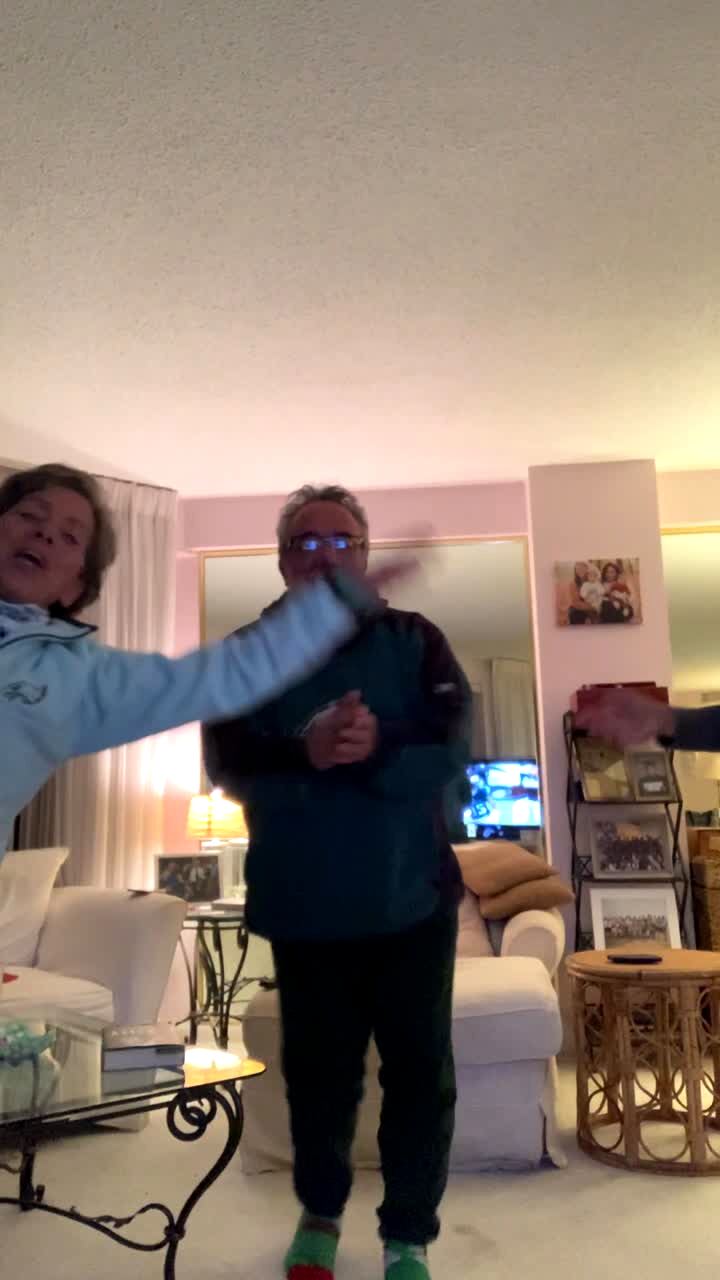 A woman and two men sing a song about the Eagles football team and one man picks up the woman and she kicks her feet in the air and she lets go and she falls on the floor and they stop in the living-room.