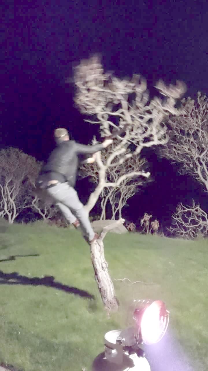 A man goes to karate chop the bottom block from giant jenga game and hits his hand on table instead then makes blocks fall to ground.