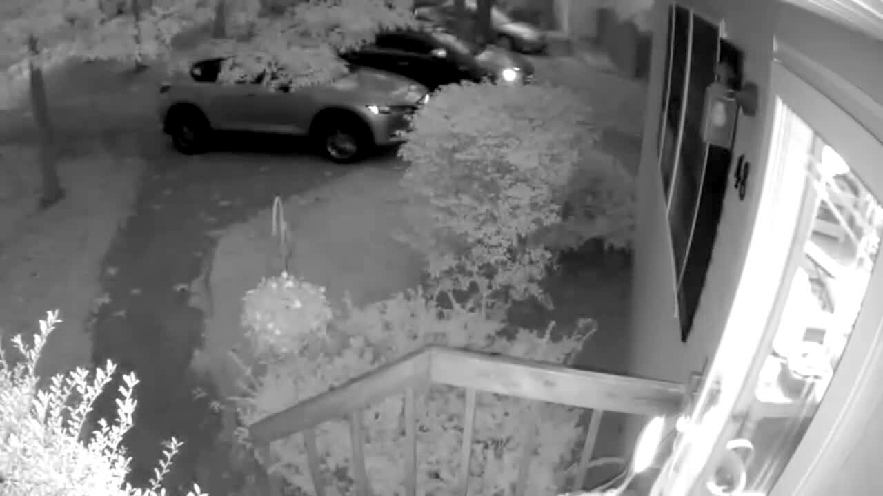 A woman with a rainbow umbrella carries a bag with Tupperware full of food on a porch and hands it to another lady in a doorway and the bag tears and falls on the floor and the food spills. Security footage.