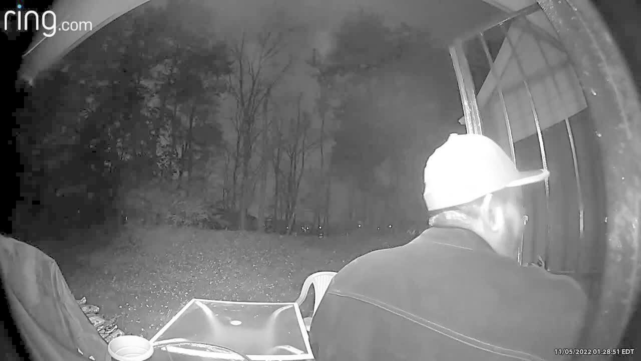 A man sits on plastic chair in his backyard but the chair tips back and man screams as he falls backwards. Security footage. Night