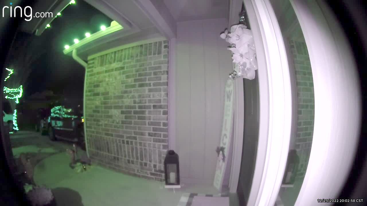 A woman runs outside and trips on a power cord connected to nativity scene decorations and she falls. A man runs out to check on her. He also trips and falls. Nighttime, Security footage, Christmas