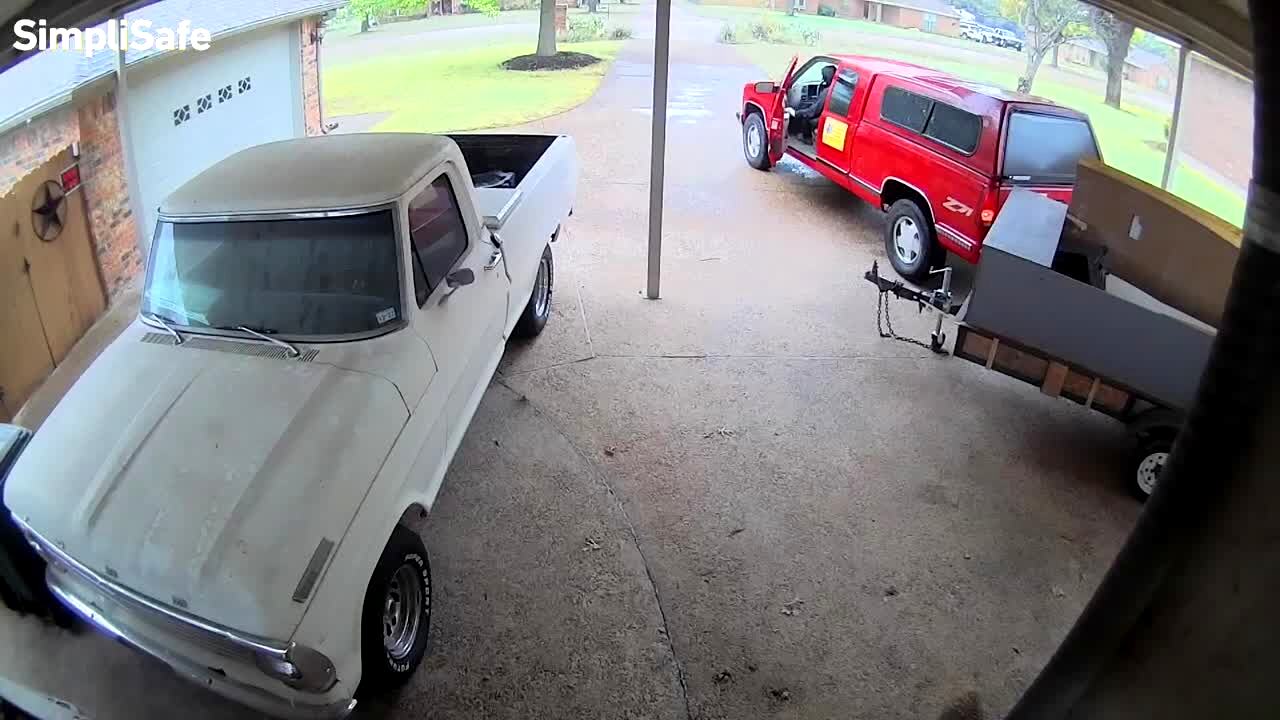 A man parks a pickup truck on a driveway and gets out of it, but the truck moves in reverse back into the driveway without him. He runs after it and yells "God damn it." Security footage. Night.
