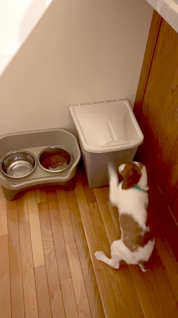 A cocker spaniel dog digs against a plastic bin of dog food at home, and a man points out that her food bowl is already full. She continues to scratch the container, then the man points out her food bowl again, and she eats out of it.