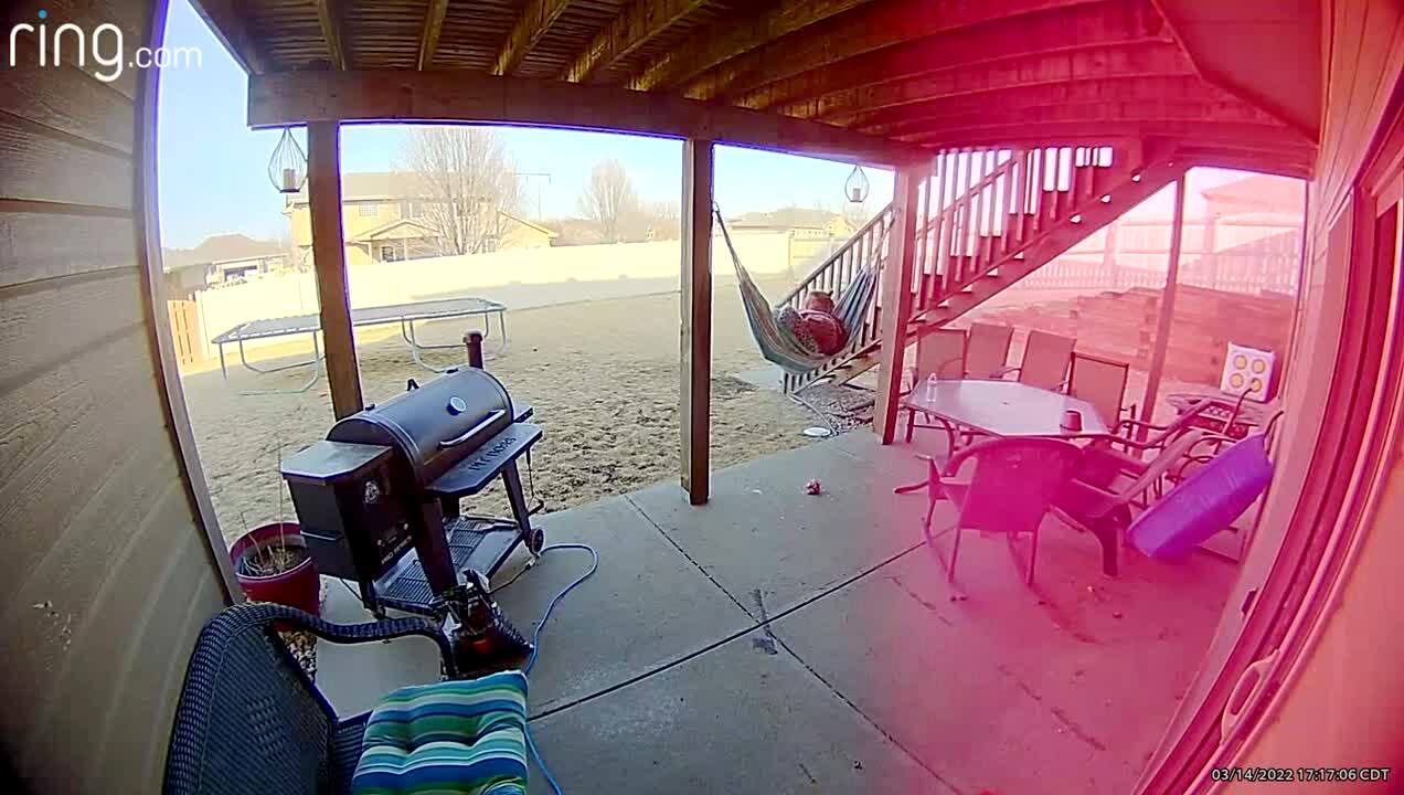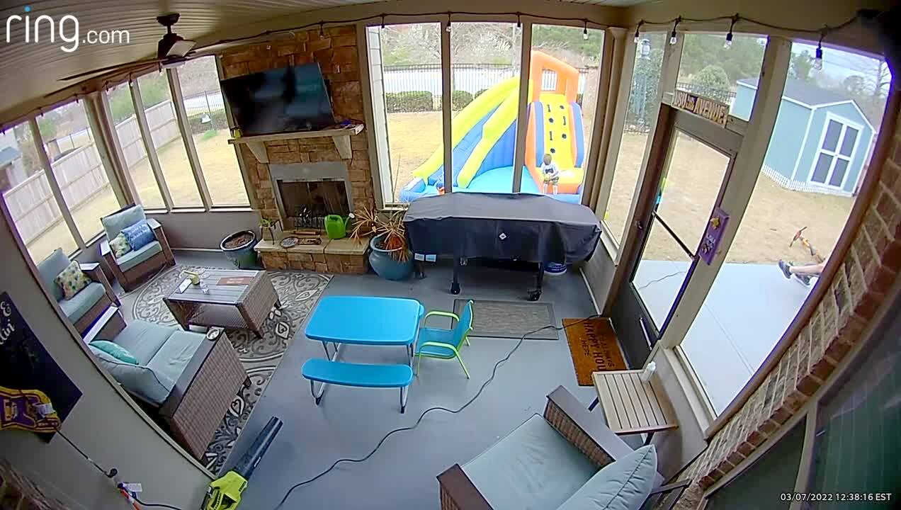 A tot boy plays on an inflatable slide in the backyard. When the wind catches and blows the structure, his dad runs to help. Security footage. Ring.com.