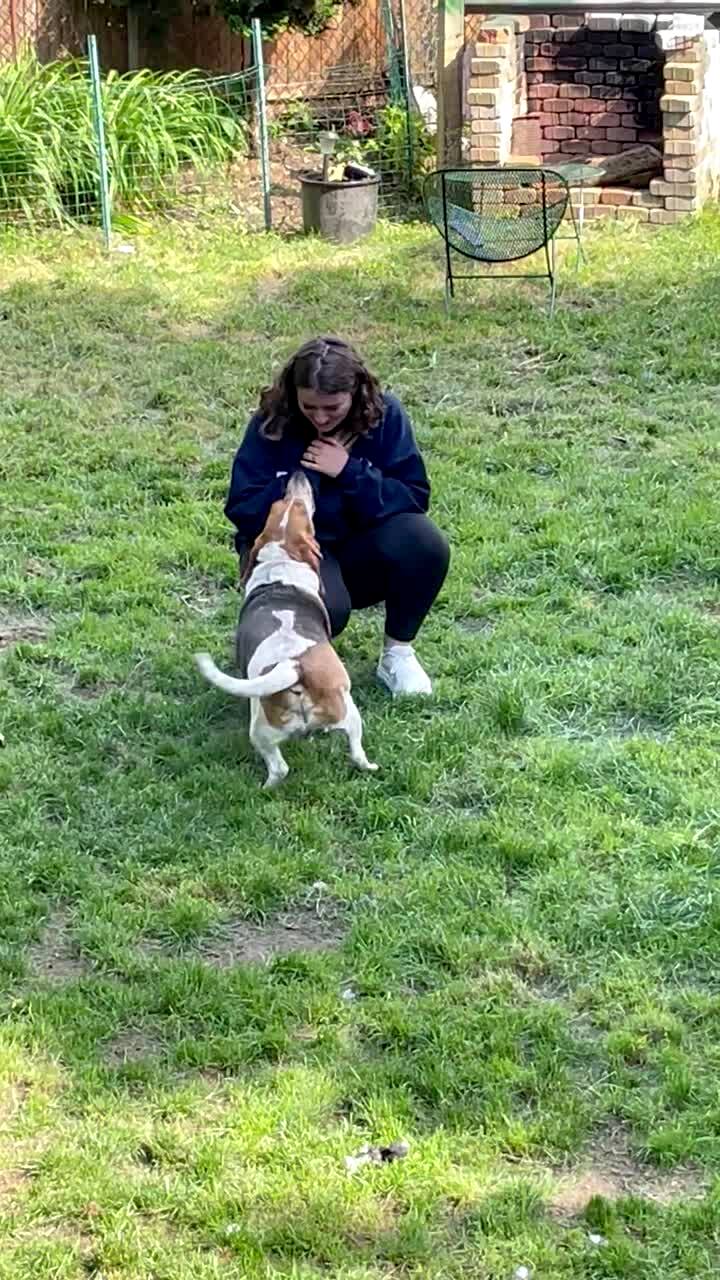 A dog runs down the stairs quickly and barks. He runs outside to a young woman who is home from college. He wags his tail and howls. Graphics. TikTok