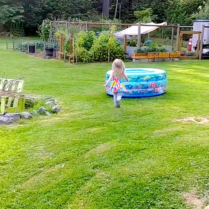A dog runs underneath a kiddie pool, moving it through a yard while a tot girl chases after it. The dog then runs out as the girl gets under the pool, as if they swapped places. TikTok.