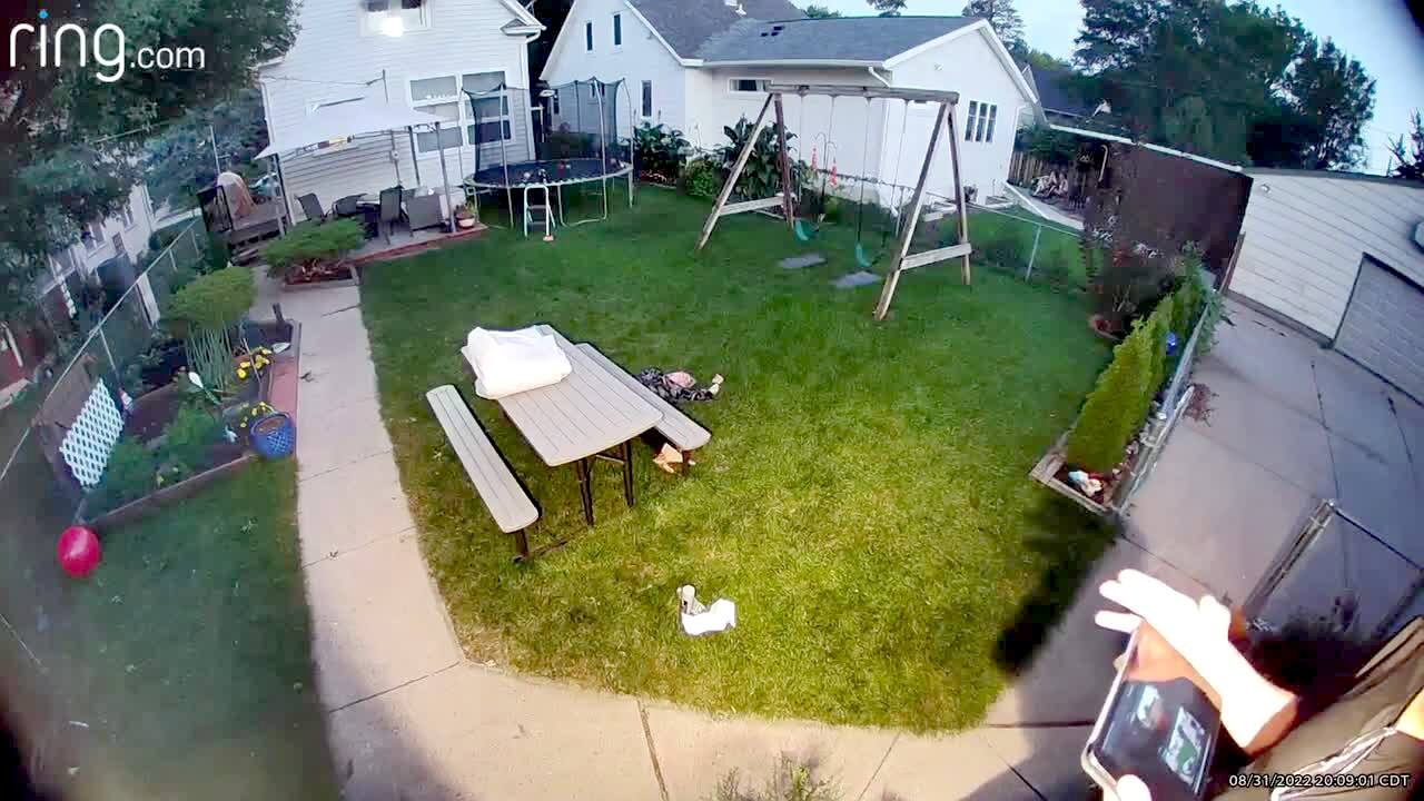 A woman folds a blow-up pool on a picnic table. She sits on it to compress it and falls over the table and onto the grass. Security Camera Footage.