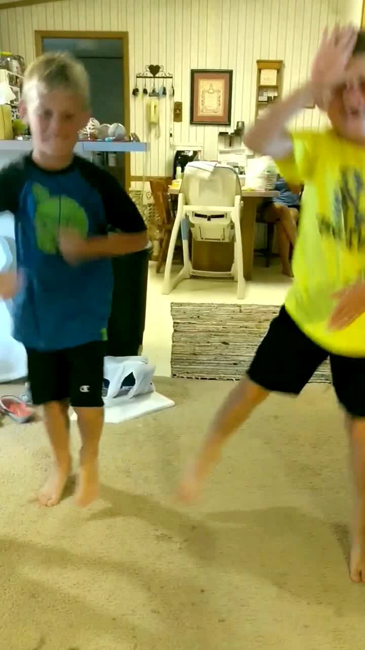Two young boys dance in the living room then their grandma joins them before she eventually falls down.