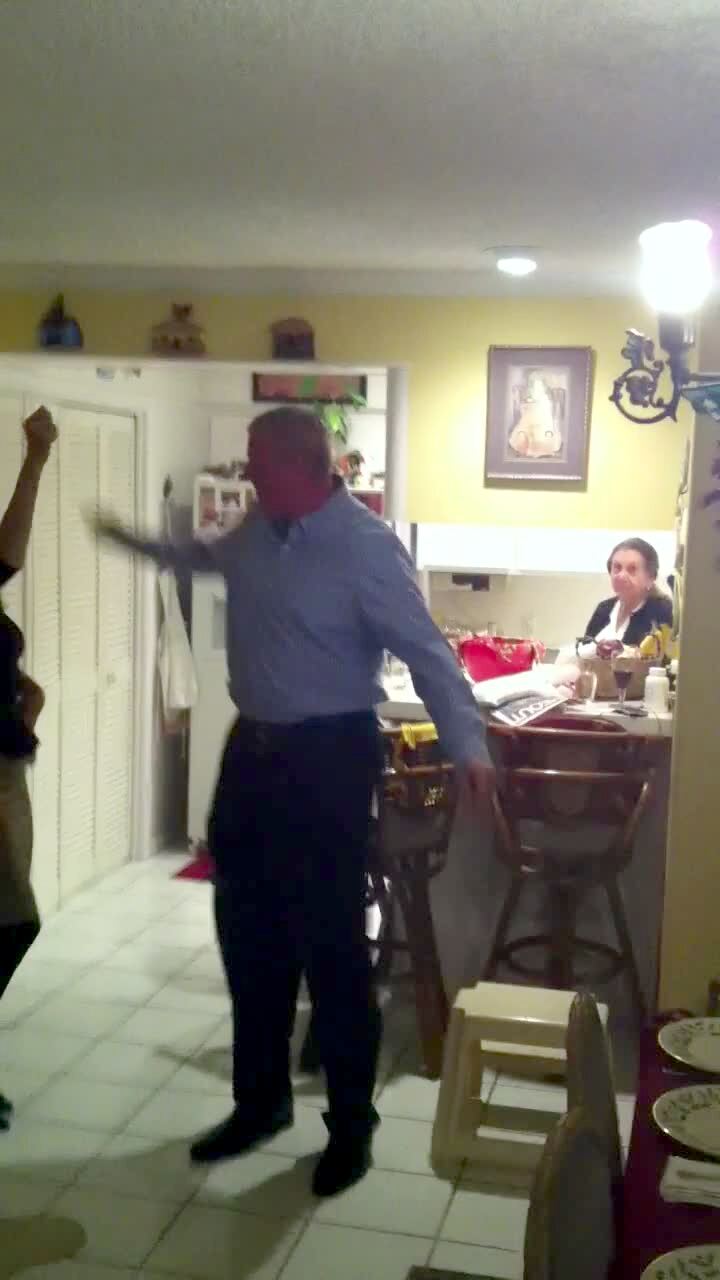 A man dances to music in a kitchen and a young boy dances and battles him and their family laughs. The man does a handstand but kicks a kitchen window and breaks it.