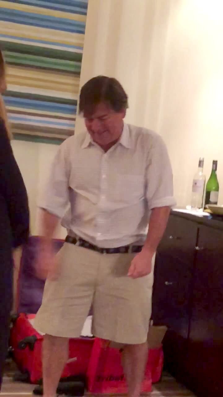 A man dances to a song with his teen daughter indoors when he dips her and she slips, causing him to fall over.