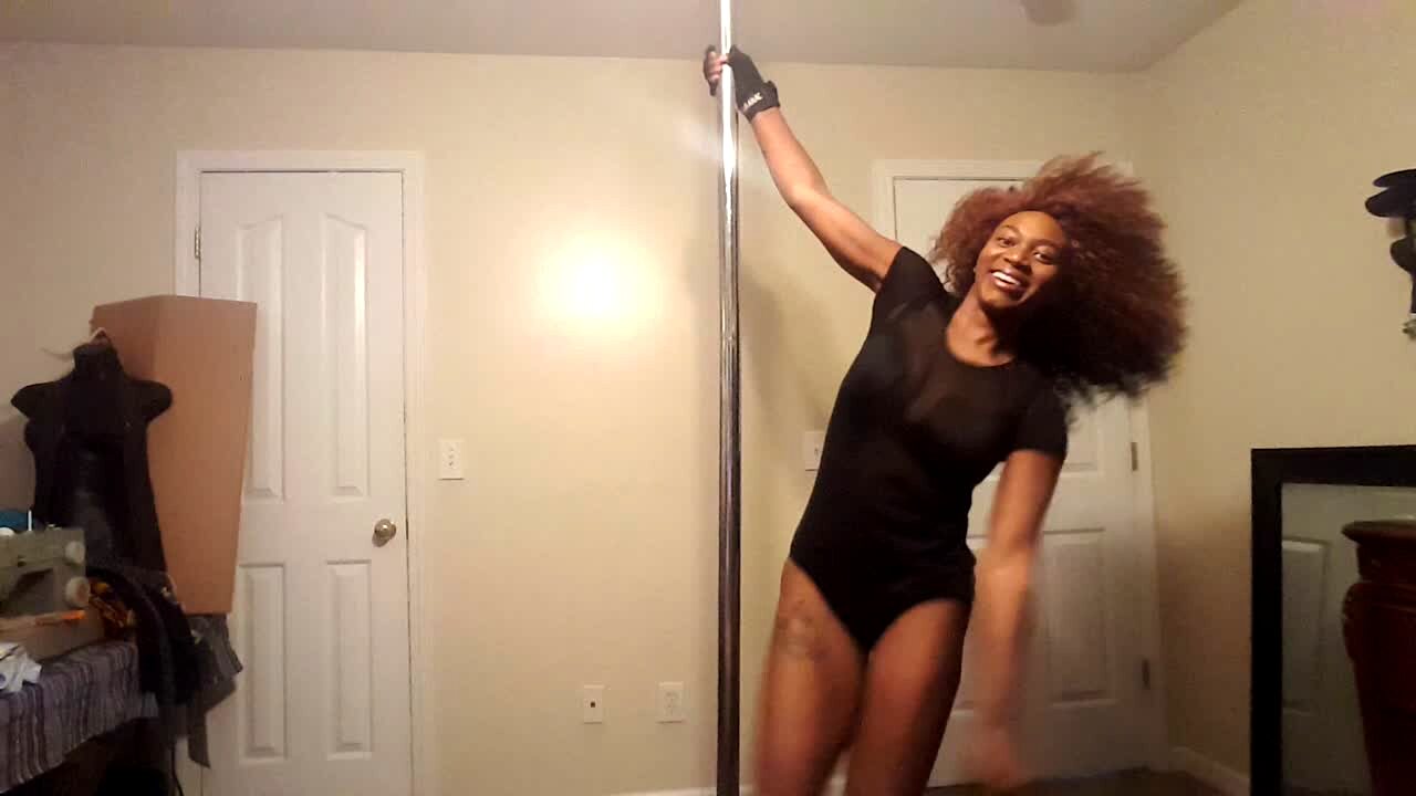 A woman pole dances along with a song and the pole falls down. The woman's son enters the room to check on her and his mother tells him to "get out." Music rights not cleared.
