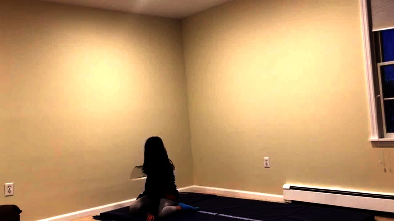 A young girl does a backflip then falls back and breaks the wall indoors.