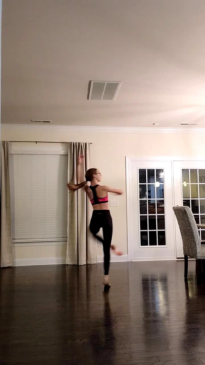 A teen girl practices pirouettes in the living room, and she kicks a curtain and knocks it off the wall after her dad warns her about it.