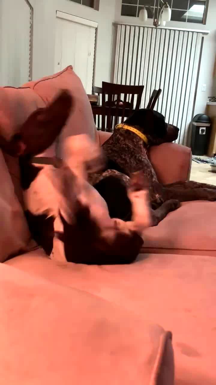 "Wolfdog Wake Up" A wolfdog dog starts to howl in a living room, and a woman tells him not to because everyone else is asleep. He howls anyway, then two other dogs join him.