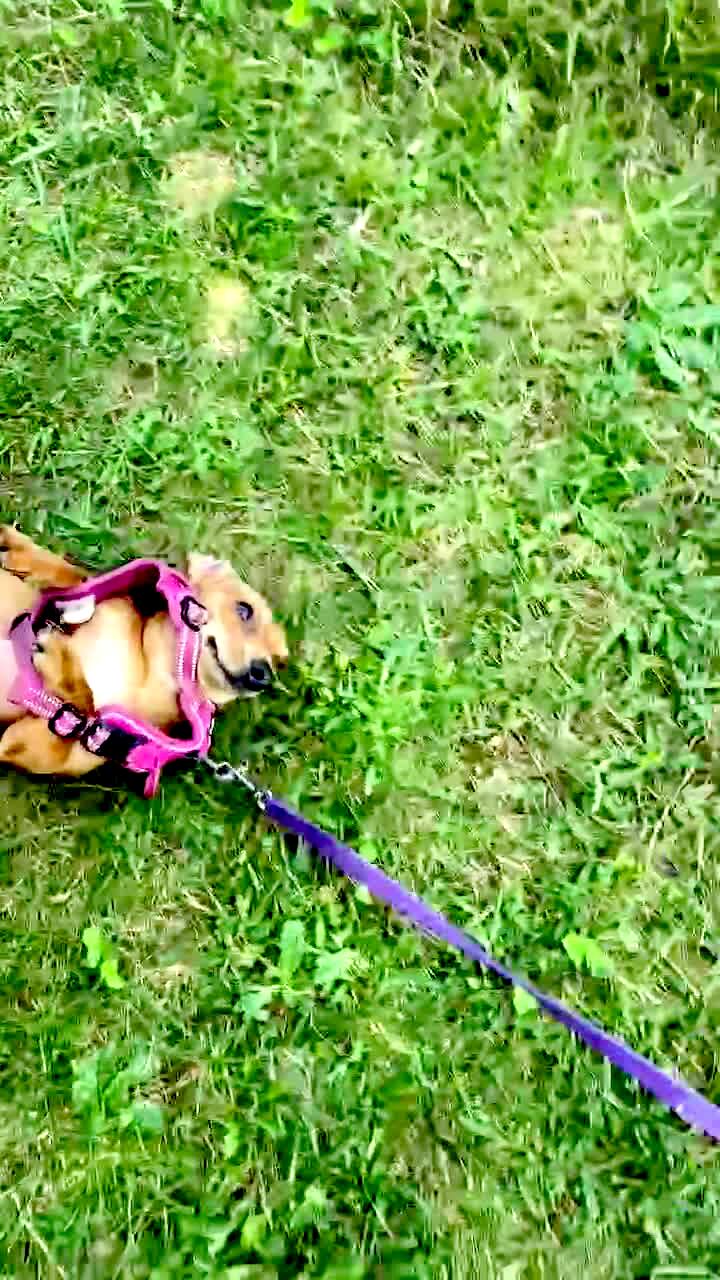 Two dachshund dogs walk on a leash in a yard and they pull another dachshund dog that lies on its back across the yard.