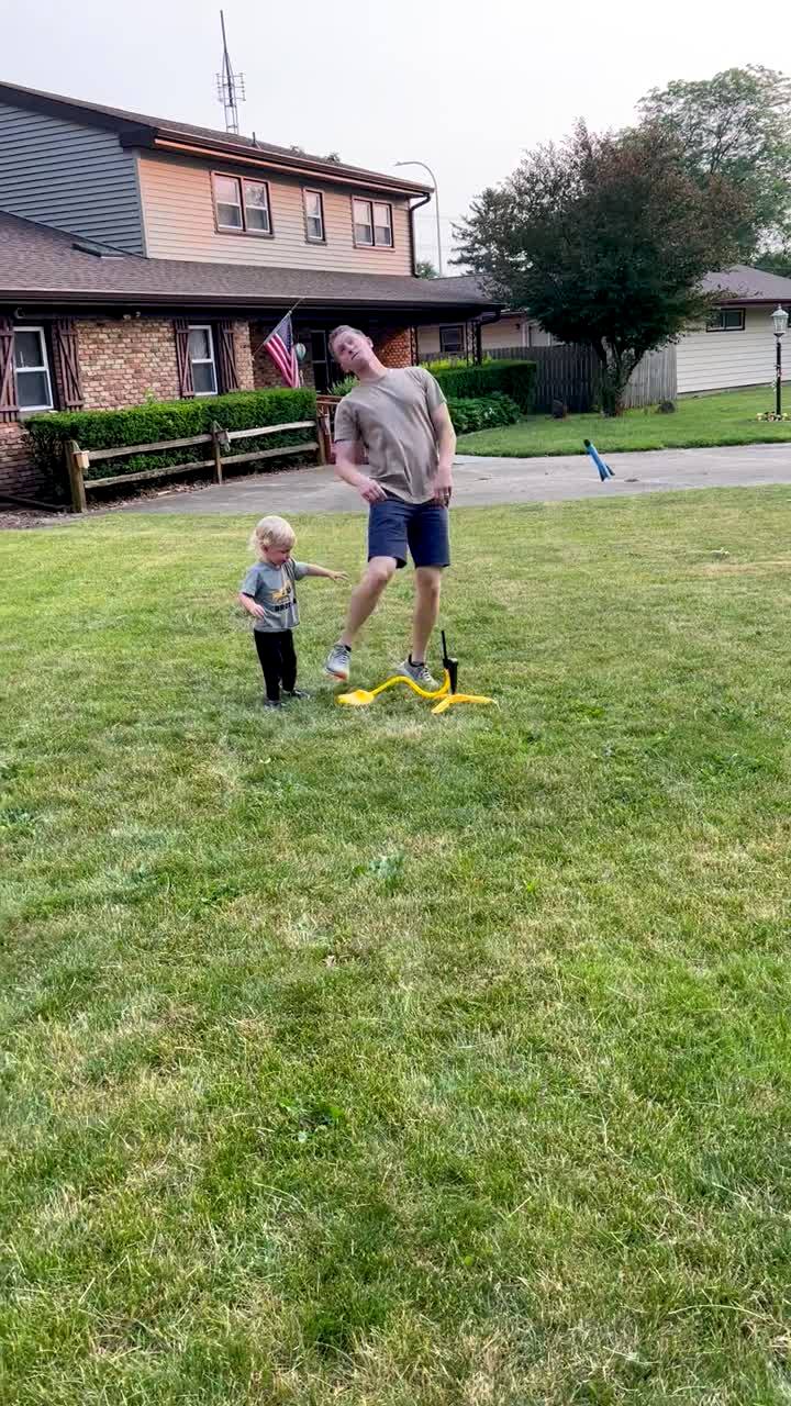 A man pushes a woman on a swing-set in a yard, as a young girl screams when the swing-set stars to shake and wobble. The woman then pushes the man over with her feet which sends him in the air and down to the yard, knocking over the camera. Video rotates sideways. (:52)
