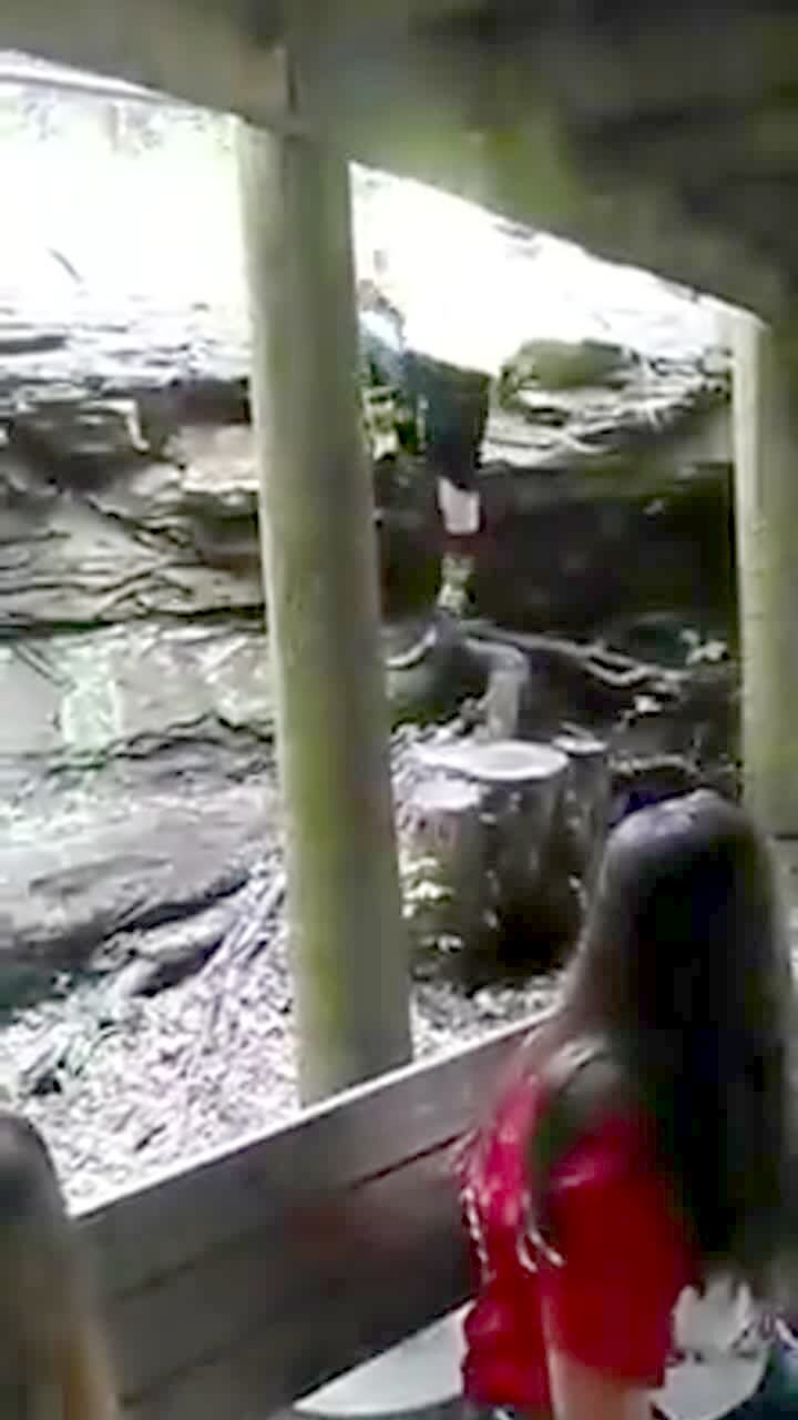 A woman walks down the icy front steps and slips and falls dramatically into the front-yard and lies on the ground and laughs. Security footage.