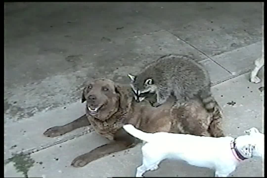 A man takes a dog out on a leash on snowy porch stairs. The dog pulls the man down and he slips and falls onto the porch. Security footage