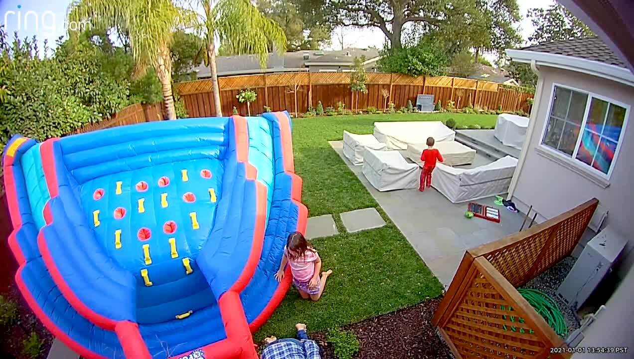A woman, young boy and young girl play on an inflatable slide in a yard and it tips over and the woman falls out. Security camera.