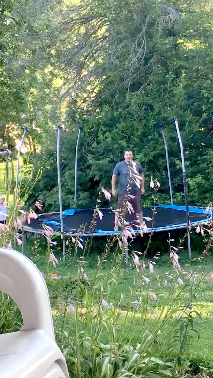 A young boy plows into a bush in a backyard while he rides a motorized bicycle. Security footage.