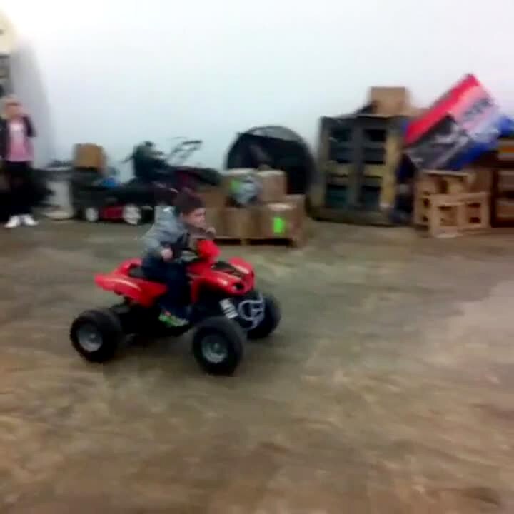 A woman tries to jump over a tot boy riding a toy ATV outdoors and trips and lands on the boy instead.