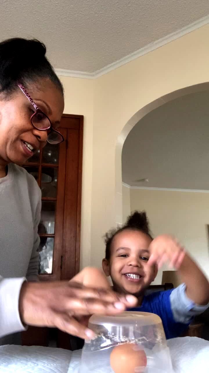 A woman films a baby boy at home, then it sounds like the baby boy says "can you back up?"