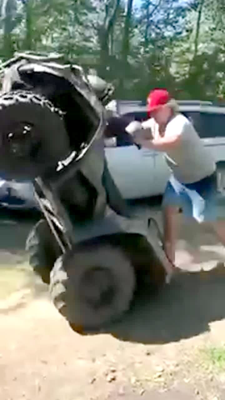 A man lays in a hammock in the basement and a pole rips away from the wall and he falls and a woman on the steps stomps her foot and says "what did I just say!". Security footage.