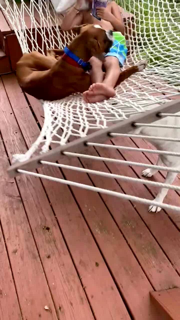 A young boy and a dog lay on a hammock and swing over a second dog on the porch. The dog rolls over and falls off the hammock.