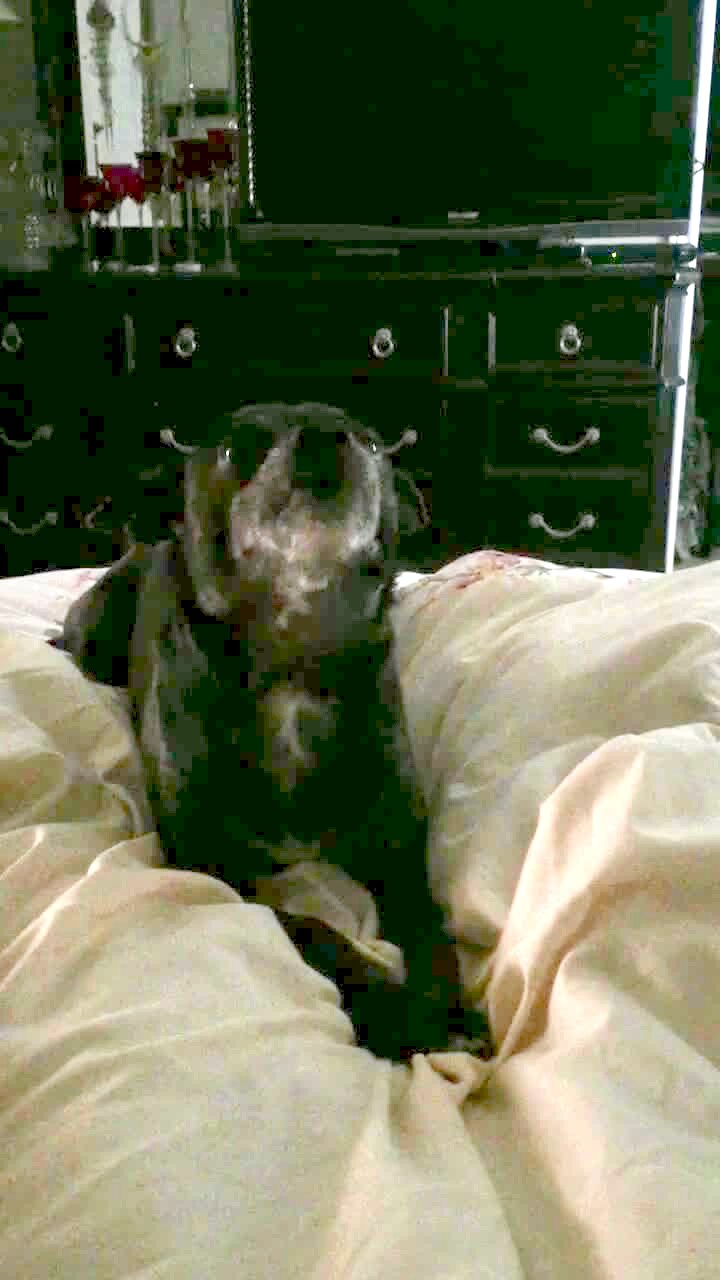 A woman talks to a dog as he tries to sleep and he makes noises.