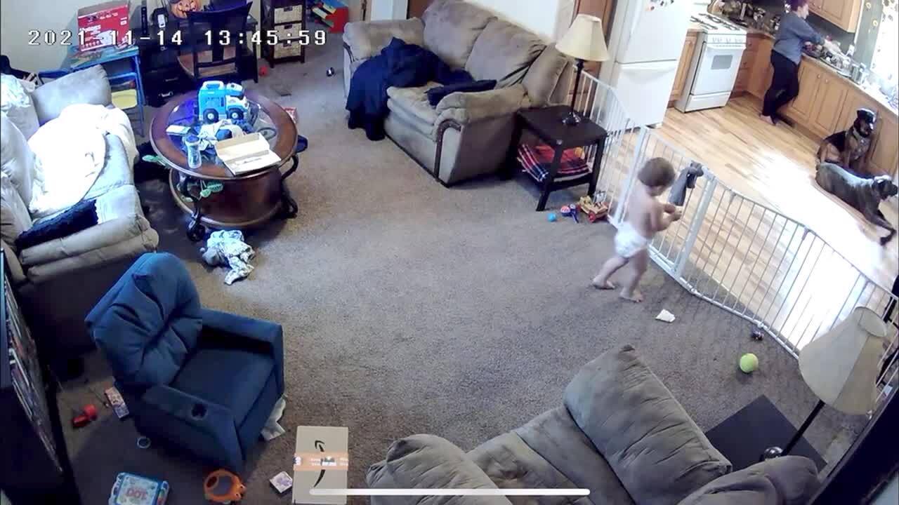 A teen boy climbs a bunkbed in the bedroom but it collapses. Security Footage